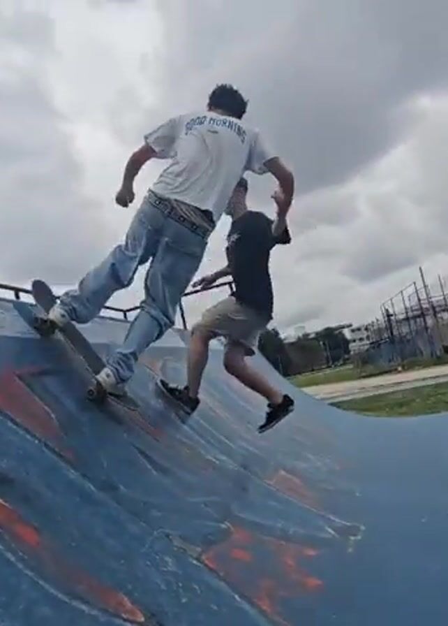 Two young men are at a skate park