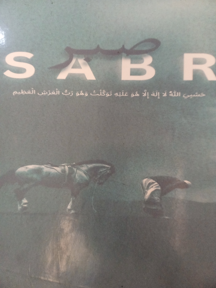 word "SABR" in English letters with the Arabic word for "patience" above the letter "A." Below the word is a verse written in Arabic. At the bottom, there is a blurred image depicting a horse and a man bowing, possibly in prayer. The overall tone suggests patience, reliance on God, and humility.