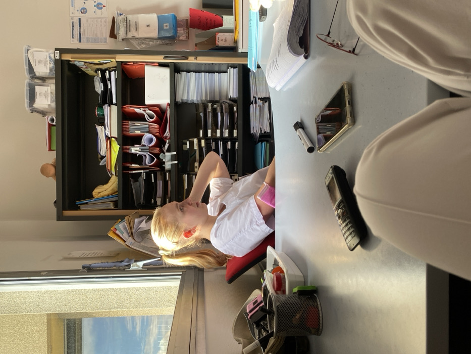 The image portrays an indoor office or administrative setting in Tourcoing, France, bathed in natural sunlight. On the left, a blonde-haired individual, appearing female, with hair in a ponytail, is seated in a red office chair. She wears a white short-sleeved top and has a pink medical cuff or bandage on her left forearm. Her right hand is positioned behind her head/neck, and she looks towards the left, facing a window that shows a clear sky and the exterior of a textured building. Behind the seated individual is a dark metal shelving unit containing numerous files, binders, and office supplies. The top shelf displays a skin-toned baby doll head on the left and two clear plastic storage containers on the right. Below, shelves are organized with red folders, stacks of paper, and various documents. To the right of the shelving unit, a white wall features several wall-mounted administrative notices, some in French, including one titled "Le Lavage des Mains," and a dispenser for hygiene products. In the foreground, a light gray desk surface is visible. Items on the desk include a black feature phone with a keypad, a gold-colored smartphone, a small white and black cylindrical object (possibly a pen or marker), an open textbook or binder, and a pair of red-rimmed glasses resting on the book. On the far left of the desk, a metal mesh pen holder contains writing implements, alongside a white rectangular tray holding additional items. The lower half of a second person's legs, clad in white trousers, are visible in the immediate foreground, indicating another individual is seated opposite the blonde person at the same table.