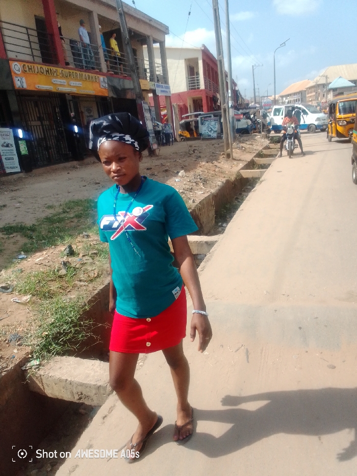 This image captures a street scene in Egbagu, Nigeria, on a bright, sunny day. The primary subject is a dark-skinned woman positioned in the lower-left to central foreground, facing slightly right of the camera. She wears a black satin-like head covering with a white and black checkered band visible at the front, a teal short-sleeved t-shirt with a white and red "FX" logo on the chest, a short red skirt with two golden buttons on the front, and brown flip-flops. A light-colored beaded bracelet is on her left wrist, and a blue beaded necklace is visible around her neck. Her expression is neutral, and her gaze is directed towards the camera. She stands on a light-colored concrete sidewalk that runs diagonally from the lower-right foreground towards the upper-left background. To her left, there is a dirt shoulder with sparse green grass and some litter. A concrete drainage ditch separates this dirt area from the sidewalk. Behind the woman, on the left, is a two-story commercial building with a "CHIJOHNZ SUPERMARKET" sign prominently displayed on the first floor. This building features exposed red brick elements, light-colored walls, and dark railings on the upper balcony where two individuals are visible. To the right of the woman and extending into the background is a paved road. Multiple vehicles are present on the road, including white vans, several yellow and black commercial tricycles (keke napep), and a person on a motorcycle in the mid-ground. Other pedestrians are faintly visible further down the street. Utility poles and overhead lines are visible along the street, casting shadows. The sky is clear and light blue. The bright sunlight casts distinct shadows of the woman and objects onto the ground in the lower-right foreground.