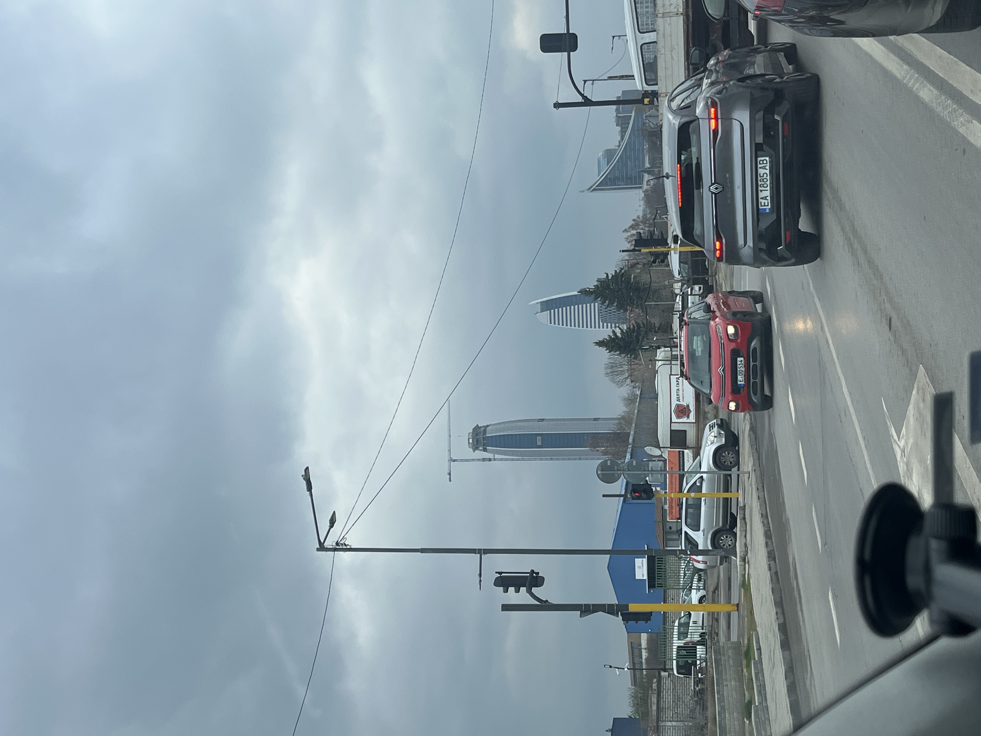 An urban street scene in Sofia, Bulgaria, depicts multiple vehicles stopped or moving slowly under an overcast, grey sky. The vantage point is from inside a vehicle, evidenced by a dashboard-mounted suction cup device in the lower left foreground. In the mid-ground, a dark grey Renault Megane E-Tech electric car (Bulgarian license plate EA 1885 AB) occupies the right lane, its brake lights illuminated. To its left, in an adjacent lane, is a red Citroën C3 Aircross (Bulgarian license plate E DD 514). A white truck is partially visible to the right of the Renault, and a dark vehicle is partially visible to the far right. Further left, parked or stopped on the side, are a silver SUV (possibly a Honda CR-V) and a white van. The background features several prominent modern buildings that identify the location as the Business Park Sofia / Sky Fort area, likely viewed from Tsarigradsko Shose boulevard. The tallest structure is the Sky Fort skyscraper, appearing cylindrical and under construction, with a large crane visible at its summit. To its right, two other distinctive, curvilinear buildings, known as Capital Fort, exhibit white and blue/grey facades. Street infrastructure includes multiple black traffic light poles with functional signals (one vertical, another red and partially obscured), tall streetlights with modern LED fixtures, and overhead power lines traversing the frame. On the left, a concrete sidewalk runs alongside the road, behind which is an industrial or commercial area with blue corrugated metal buildings and bare trees. The road surface is paved with visible white lane markings. No pedestrians are visible.