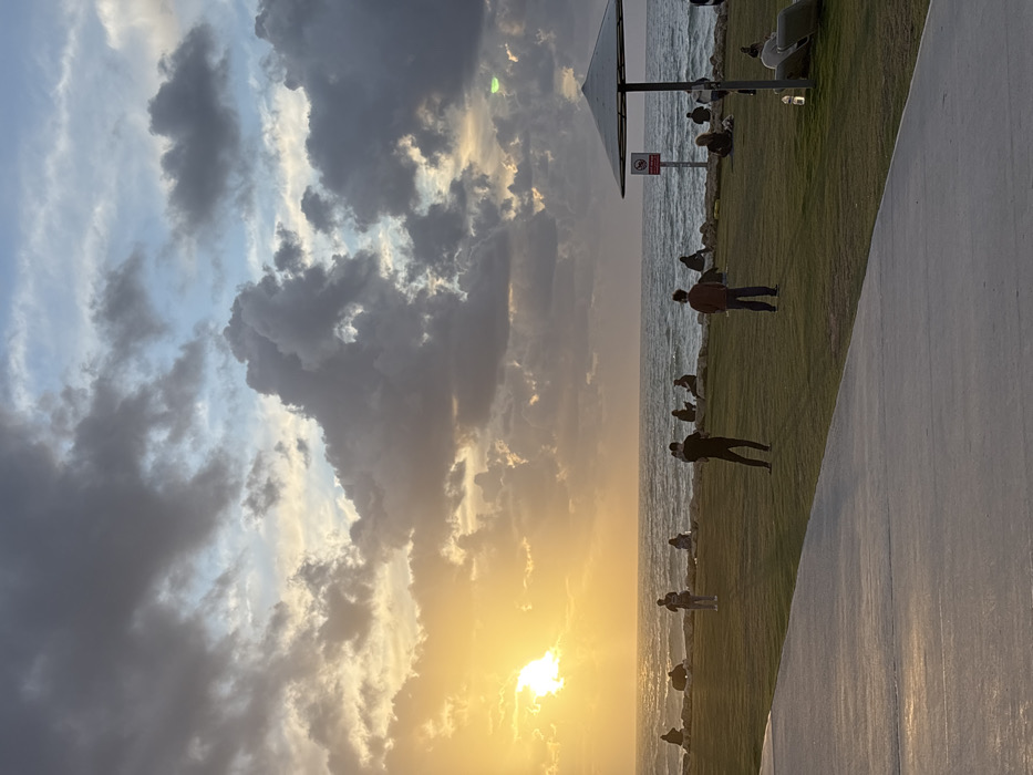 The image depicts a coastal scene at sunset in Tel Aviv, Israel, likely along the city's promenade overlooking the Mediterranean Sea. The sun, a bright golden disc, is low on the western horizon, casting an intense glow and light rays across the water. The sky is largely covered by a dramatic array of dark grey and cumulus clouds, with some illuminated by the sun's golden light and patches of lighter blue sky visible. The foreground features a light-colored, paved pathway running diagonally from the bottom-left to the mid-right. Adjacent to this path is a wide expanse of well-maintained green grass extending to the shoreline. The sea exhibits moderate waves breaking onto the shore, which is lined with dark rocks or boulders. Approximately 20 to 30 individuals are visible. Most are distributed across the grassy area and seated or standing near the rocky edge of the sea, seemingly observing the sunset or relaxing. Three individuals stand in the mid-ground on the grass, facing towards the sea. On the far right, a dark grey, circular sun umbrella is visible, under which a person reclines on a light-colored lounge object. A red and white sign on a pole is positioned near the umbrella, close to the water's edge. No overt interactions among the individuals are discernible.