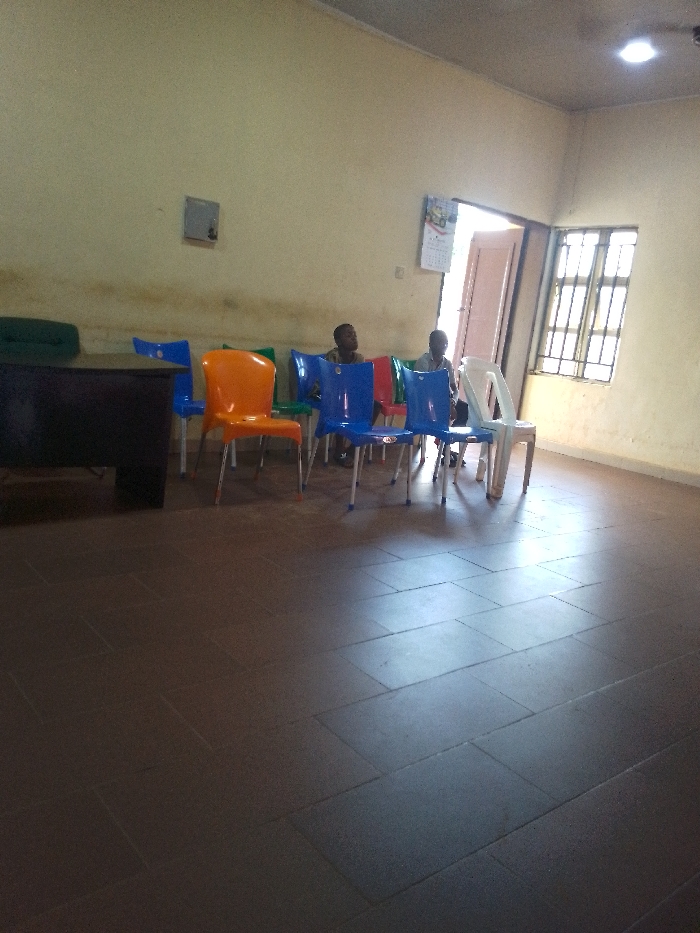 The image depicts an indoor waiting area or common room in Nibo, Nigeria