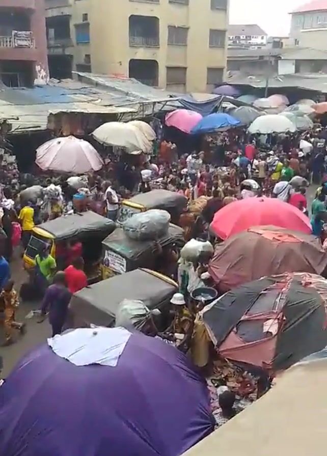The video depicts a densely crowded marketplace, viewed from an elevated position