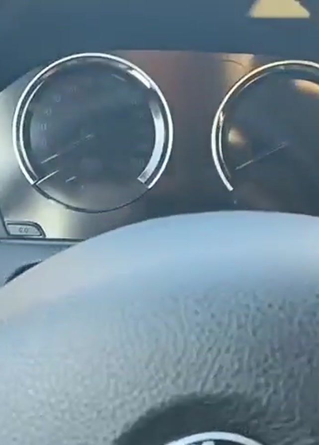 dashboard of a BMW. The camera pans up from the steering wheel to the dashboard as the car starts up. The speedometer and tachometer are visible and light up. Warning lights appear on the dashboard.
