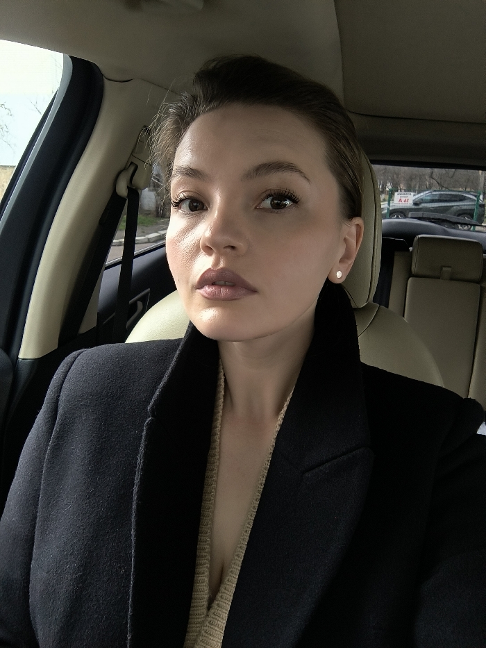 A female subject, appearing to be in her late 20s to early 30s, is centered in a frontal, close-up photograph taken inside a vehicle. She has light skin, light brown hair pulled back, and is wearing a black coat over a beige ribbed V-neck top. A small, round, white stud earring is visible in her left ear. Her gaze is directed towards the camera with a neutral expression. The vehicle's interior features light-colored leather upholstery, including a headrest behind the subject's right side and a rear seat headrest visible in the background. A dark door panel is visible on the left, and a light-colored A-pillar and seatbelt mechanism are on the upper left. Outside the vehicle, through the left window, a light-colored building, bare tree branches, and a concrete curb are visible. Through the rear window on the right, a road, bare trees, and another vehicle are discernible in the distance. A white rectangular sign with red Cyrillic text, partially legible as "АГК," is visible on the right side of the exterior view. The specific location within the city of Vinnytsia, Ukraine, is not discernible from the image.