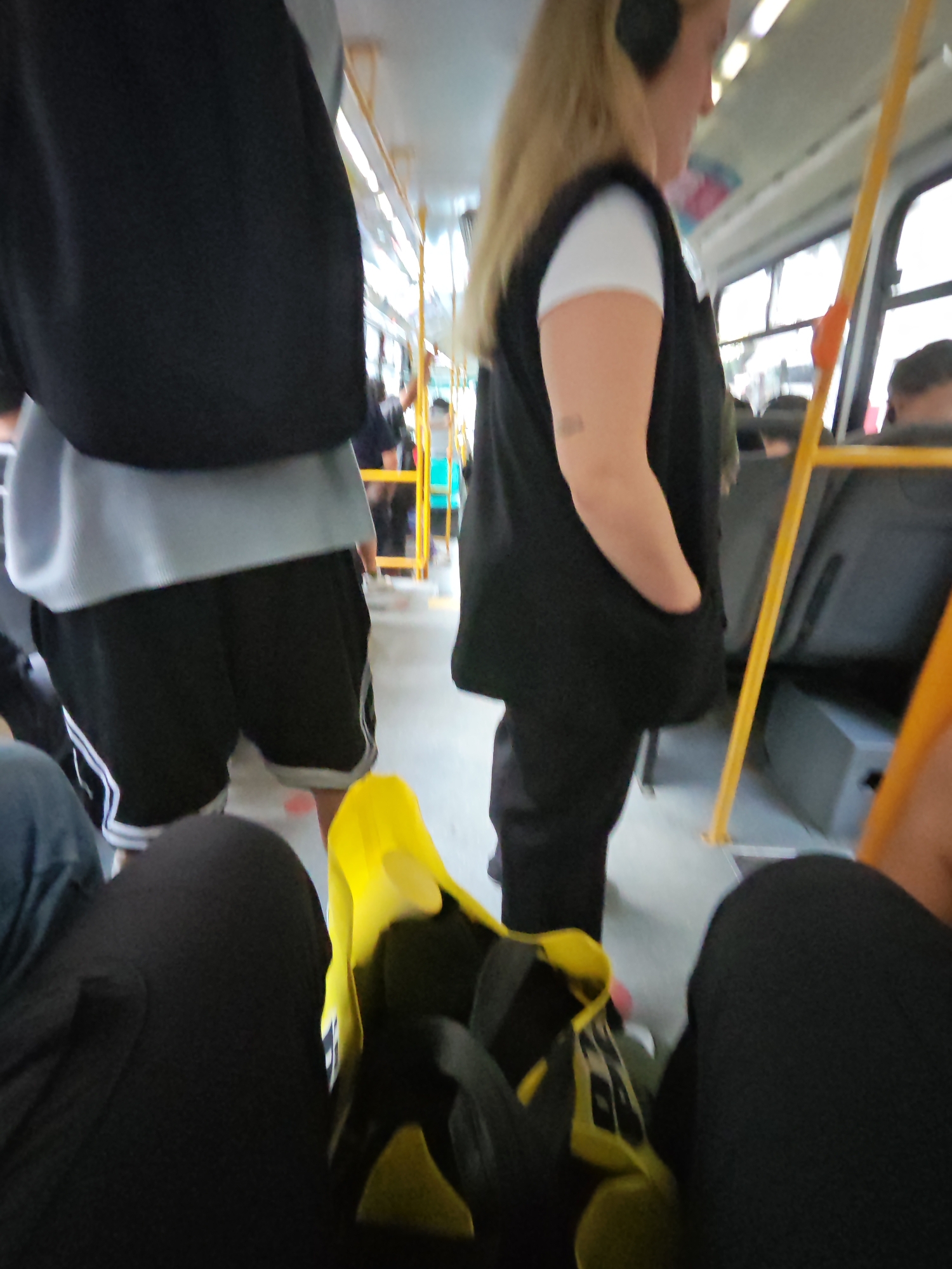 blurry view from inside a public bus. A person wearing black pants and partially visible black shoes sits in the foreground with a yellow and black backpack on the floor nearby. In the background, other passengers are visible. A woman with blonde hair wearing headphones, a white t-shirt, and a black vest is standing. Another person with a black backpack is standing to her left wearing grey shirt and black shorts. Yellow vertical poles are visible throughout the bus. Light filters in through the windows, suggesting it's daytime. The scene takes place inside a public bus in Buenos Aires, Argentina.