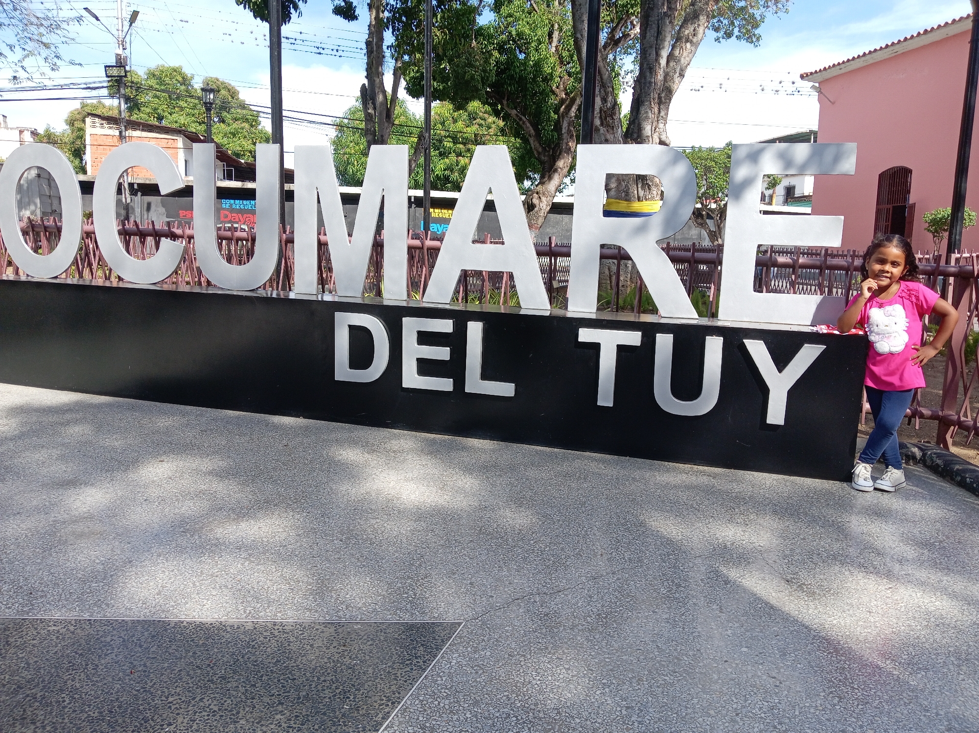 An outdoor scene in Parroquia Ocumare, Venezuela, features a young female individual standing to the right of a prominent black and white city sign. The sign displays "OCUMARE" in large, white, three-dimensional capital letters on the top row, and "DEL TUY" on the bottom row. The individual, a child with dark hair and a light complexion, wears a short-sleeved pink t-shirt with a white cat graphic, dark blue jeans, and white sneakers. She is smiling, with her left hand positioned near her chin and her right hand resting on her hip. Her legs are crossed at the ankles. The ground is a light-grey, textured aggregate pavement with distinct shadows indicating direct sunlight. In the background, behind a brown metal fence, multiple large trees with green foliage are visible. Beyond the trees, various buildings are present, including one with exposed reddish-brown brickwork and a distinct pink building with a terracotta-tiled roof on the right. Utility poles and overhead wires are visible against a partially cloudy blue sky.