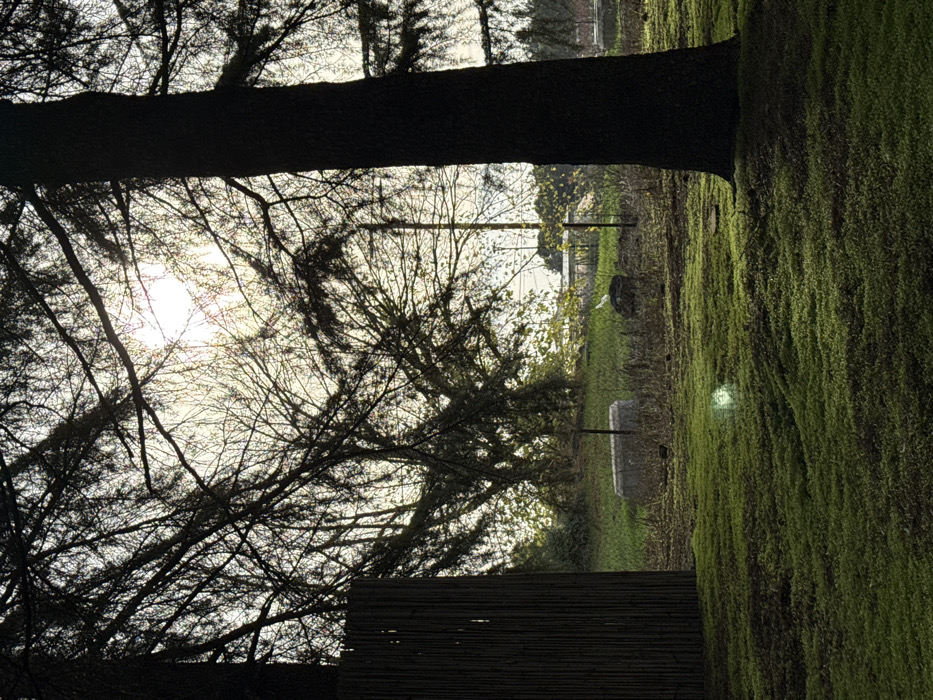 A landscape scene features silhouetted trees framing a sky with a bright sun. The branches are mostly bare. The right side shows a grassy area with what looks like moss and some structures. A portion of a dark wooden fence is in the bottom left. The orientation of the image is rotated ninety degrees counter-clockwise.