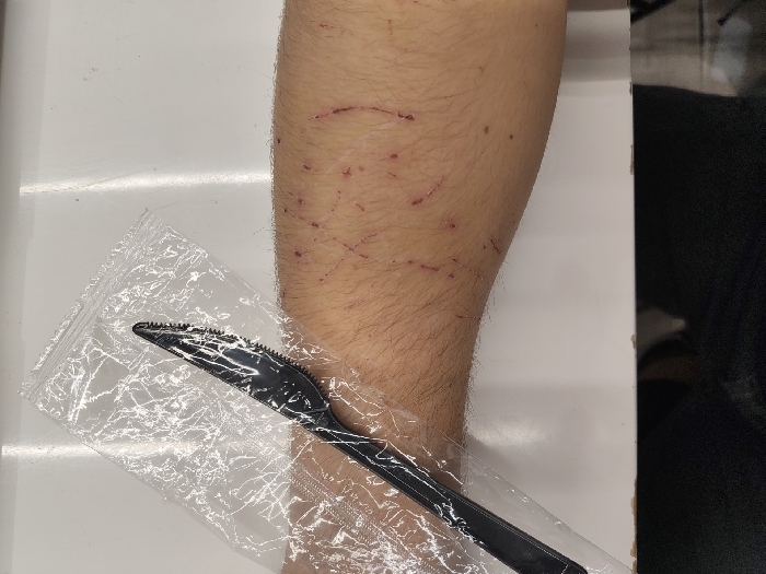 - "The image displays a segment of a human arm, exhibiting numerous superficial lacerations and scratches of varying lengths and orientations, some with visible dried blood or scab formation, consistent with skin trauma" by FM-8Zy5w1, licensed under CC BY 4.0