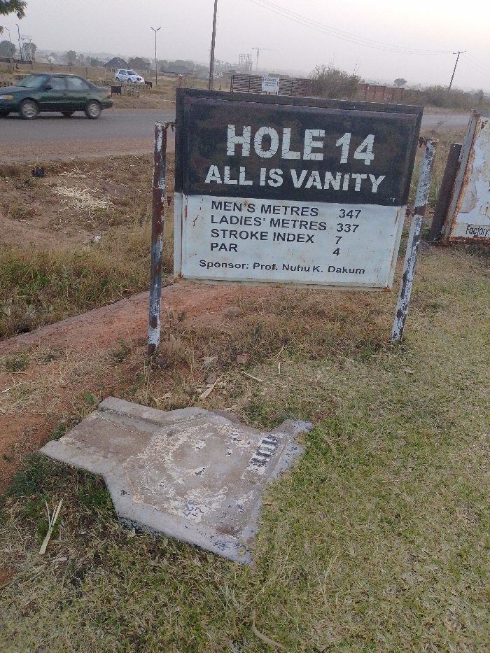 A weathered sign for Hole 14 on a golf course reads "All is Vanity." The sign indicates distances of 347 meters for men and 337 meters for ladies, with a stroke index of 7 and par of 4. The sign is sponsored by Prof. Nuhu K. Dakum. It sits in a grassy, somewhat neglected area, with a fragment of concrete lying nearby. A green car is visible in the background on a roadway. The sky is overcast.