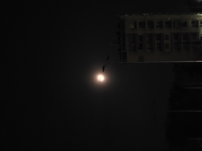 This image captures a nocturnal urban scene in Sofia, Bulgaria. A prominent, bright, diffused circular light source, consistent with a veiled full moon, is situated in the upper-central portion of the dark sky. To the right, a multi-story building, appearing in pale yellow or beige tones, rises from the lower frame. This structure displays at least seven visible floors, each featuring windows and balconies across its facade. A tall, dark street light pole, equipped with a two-headed luminaire arm, stands to the left of the building, extending vertically towards the overhead light source. Further to the left and in the mid-ground, indistinct silhouettes of additional street light poles and trees are discernible against the dark environment. No individuals or observable activities are present. The scene is illuminated by the celestial source and ambient artificial street lighting, leaving significant areas in shadow.
