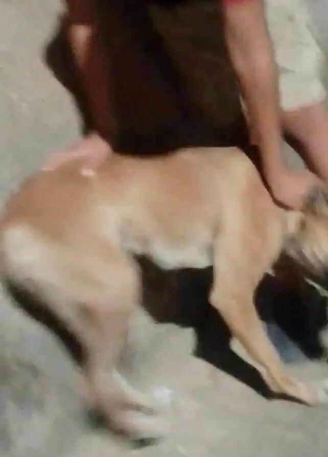 A child wearing a red shirt, light-colored shorts, and blue shoes is petting a tan-colored dog on a concrete surface. The dog is standing and appears to be responding to the petting, looking up at the child. The scene seems to be taking place outdoors or in an unfinished area with rough concrete. The camera moves around during the video.