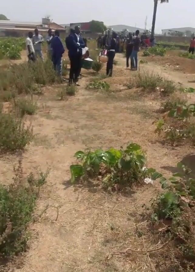 group of people gathered in an open, dry, sandy field with scattered vegetation. Some individuals are wearing suits, while others are in casual clothing. One person is carrying a white object, possibly a container or bag. There is a palm tree in the background, along with a building in the distance. The overall scene appears to be outdoors and possibly in a rural or semi-urban setting. There is music playing.