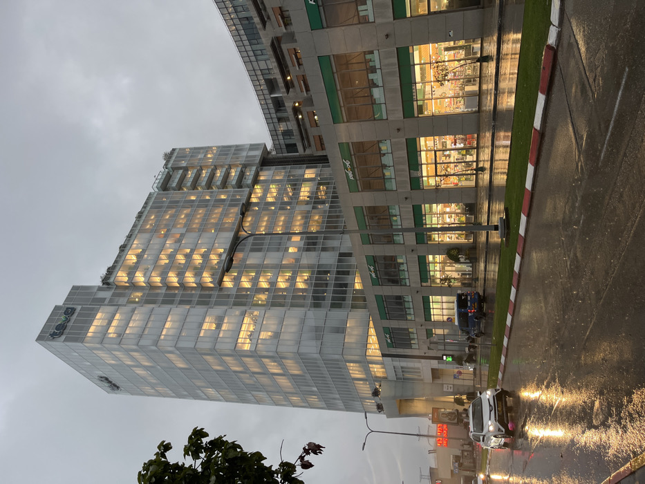 The scene depicts an urban street view in Tel Aviv, Israel, specifically the Teva Pharmaceutical Industries headquarters and surrounding commercial complex on HaMenofim Street in Ramat HaHayal. The weather is overcast, and the asphalt road is wet from recent precipitation, reflecting artificial lights. A tall, modern skyscraper, primarily constructed of glass and light-toned panels, dominates the background. The "Teva" logo is visible near its apex. Numerous windows across its facade are illuminated with warm yellow light. Adjacent to the skyscraper, at ground level and extending horizontally to the right, is a lower commercial building. Its ground floor features multiple retail storefronts, identified by "Polygad" (פוליגד) signage, which are brightly lit, showcasing various products within. In the foreground, a dark, wet asphalt road occupies the lower portion of the image. A white SUV, possibly a Toyota RAV4, with its headlights on, is observed moving from left to right. To its right, a dark blue utility van is either stationary or moving slowly near the curb. A low concrete median strip, marked with red and white painted edges, separates the road lanes. A black streetlamp pole stands in the mid-ground. Minimal tree foliage is visible in the upper left corner. No discernible individuals are clearly visible on the street or within the vehicles.