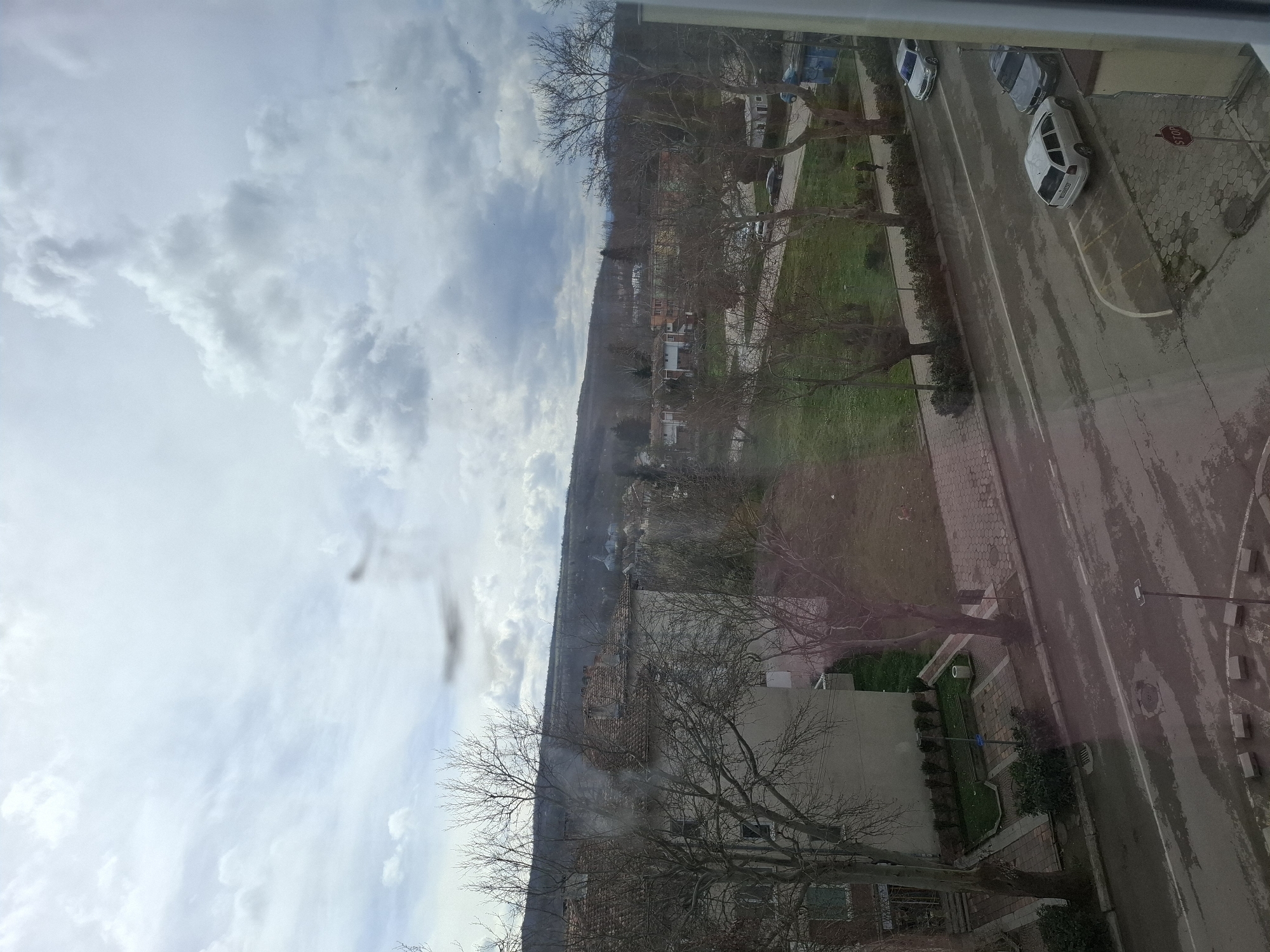 The image depicts an elevated view of a street scene in Strazhitsa, Bulgaria, under an overcast sky. The upper third of the frame shows a sky filled with grey and white clouds, exhibiting varied densities and some brighter areas. A dark, diffuse smudge is visible within the cloud cover in the upper-middle portion. The midground features a combination of urban and natural elements. On the left, a light-colored, multi-story building with a visible section of a red-tiled roof is partially obscured by several large, bare deciduous trees. Central to the midground is an expansive, unkempt grassy area, appearing damp and uneven. Beyond this green space, a line of residential buildings with diverse facades, including light blue and orange, stretches towards the base of a distant range of forested hills that span the horizon. The foreground is dominated by a wet, two-lane asphalt road with a solid white centerline. Paved sidewalks, constructed from patterned concrete blocks, run parallel to the road on both sides. An evergreen hedge borders the left sidewalk. Lining the road are numerous mature deciduous trees, currently bare of foliage. A red octagonal STOP sign on a pole is positioned on the right sidewalk, facing away from the camera. A street lamp pole is visible near the bottom center. Three vehicles are parked along the right side of the road. Closest to the viewer is a white station wagon displaying Bulgarian license plate PB 8975 KP. Behind it is a dark-colored sedan, followed by a silver Mercedes-Benz C-Class (W203) sedan. One individual, dressed in dark clothing, is observed walking away from the viewer on the right-hand sidewalk, positioned between the parked silver sedan and the street lamp.