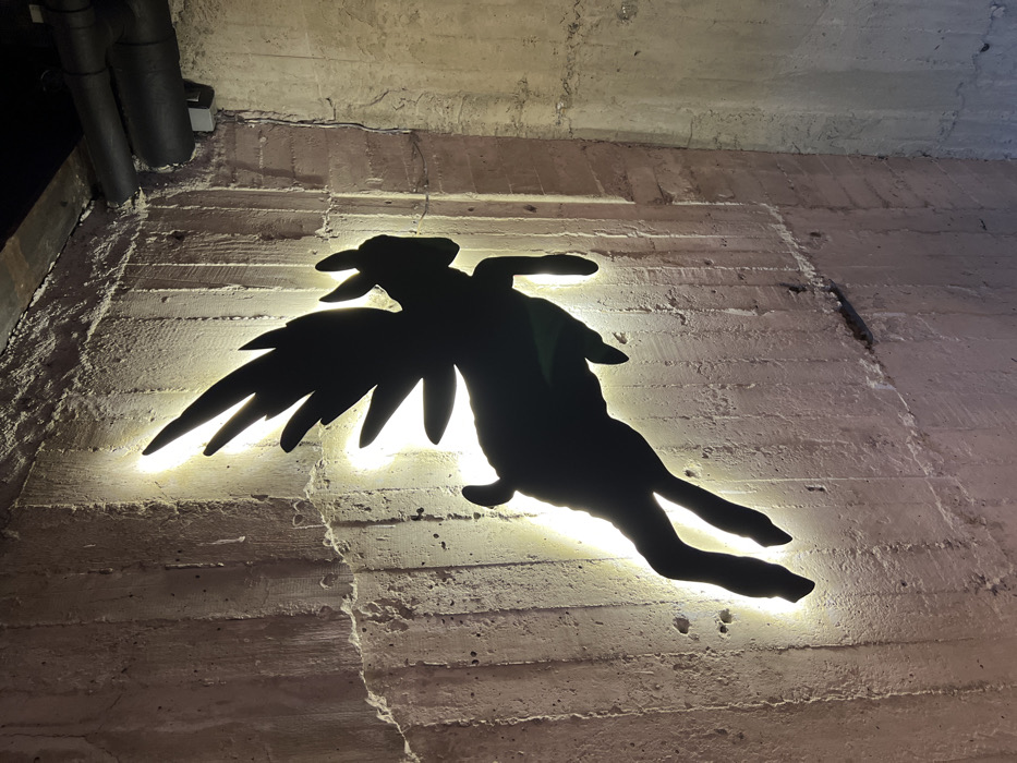 A stark silhouette of a winged creature, possibly a mythological being or stylized animal, is mounted on a rough, textured concrete wall
