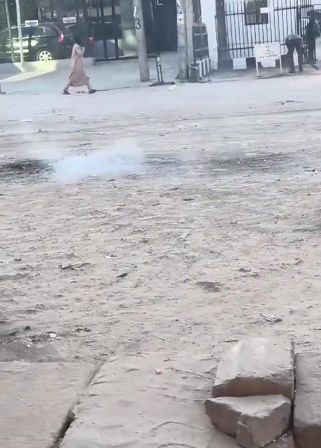 dusty, urban street scene on a possibly overcast day. The ground is mostly dirt with some concrete paving. In the initial frames, a small pile of broken concrete blocks and a hole are visible. Smoke rises from a small fire burning on the ground. A person in light clothing walks in the background. A cart stands on the side of the street. Later in the video, a person rides a bicycle in the distance. Buildings and parked cars are visible in the background, and signs indicating "ATM GALLERY" are present.