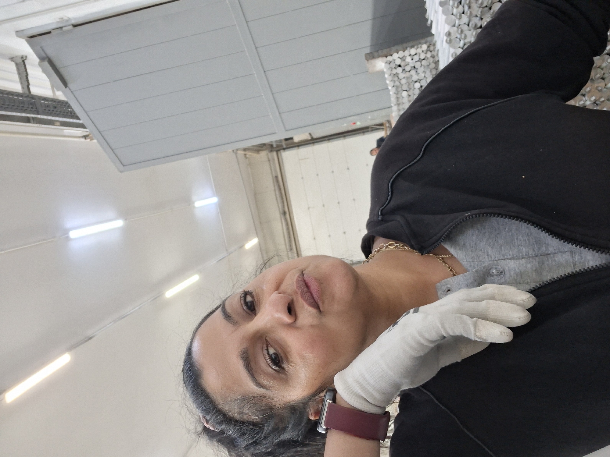 A woman with dark hair and light skin is in a large, industrial-style room, seemingly a warehouse or factory setting, possibly in Sevlievo, Bulgaria. The room is brightly lit with long fluorescent lights on the ceiling. She is wearing a black jacket over a grey shirt or undershirt, a gold necklace, and a watch with a dark red band on her left wrist. Her left hand, clad in a white glove, is visible. In the background, there are stacks of cylindrical objects, possibly metal or concrete, arranged in a neat pile. The ceiling is made of grey panels. The woman is looking directly at the camera.