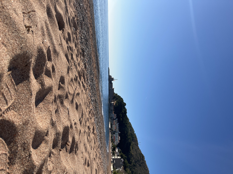 The image depicts the main beach in Petrovac na Moru, Montenegro, under a clear, bright blue sky. The foreground features reddish-brown sand, marked with numerous footprints and small shadows, indicating a low camera perspective. Scattered dark, dried plant debris is visible on the sand. A narrow strip of mixed sand and small grey pebbles transitions into the calm, blue waters of the Adriatic Sea, where faint waves gently break near the shore. In the mid-distance, on the left, a rocky promontory extends into the sea, topped by a light-colored, fortified structure, likely Kastio (the Venetian fortress), with buildings and red roofs visible directly behind it. Along the curving coastline towards the right, a series of white and light-colored buildings with varying roof colors are situated at the base of a prominent, verdant hill or mountain densely covered with trees. No individuals are visible. The sky occupies approximately the upper third of the frame, exhibiting a uniform light blue hue, with a faint aircraft contrail visible in the upper right quadrant and a lens flare originating from the upper left. The scene is illuminated by strong, direct sunlight, casting distinct shadows.