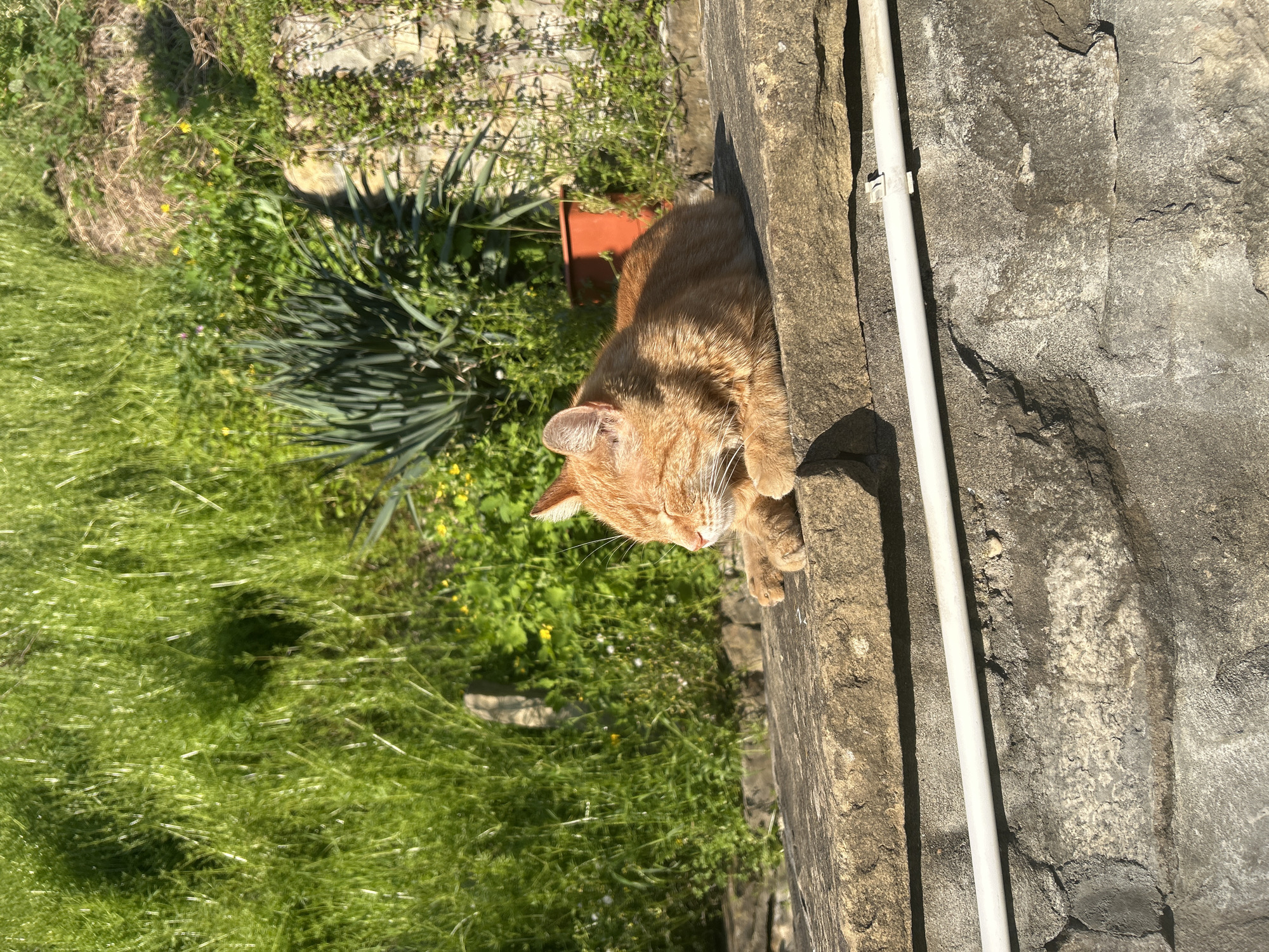 An orange tabby cat is resting on a stone ledge. A white pipe runs parallel to the ledge. Below the ledge, there is green grass and various plants. A terracotta pot is visible among the plants. The photo was taken in Veliko Tarnovo, Bulgaria.