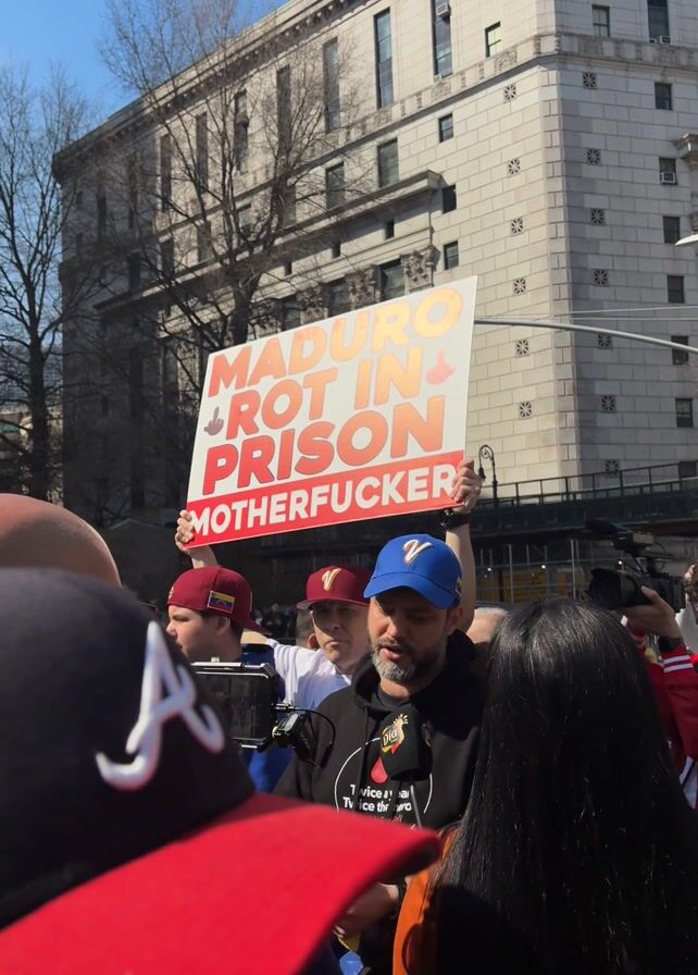A crowd protests in front of a stone building on a sunny day. The protesters hold signs. One sign reads, "Maduro rot in prison, motherfucker." A man wearing a blue baseball cap with the letter "V" is holding the sign. People are wearing baseball caps with other logos. The background shows trees and a tall building with visible architectural features. The atmosphere seems charged with a call for justice or change.