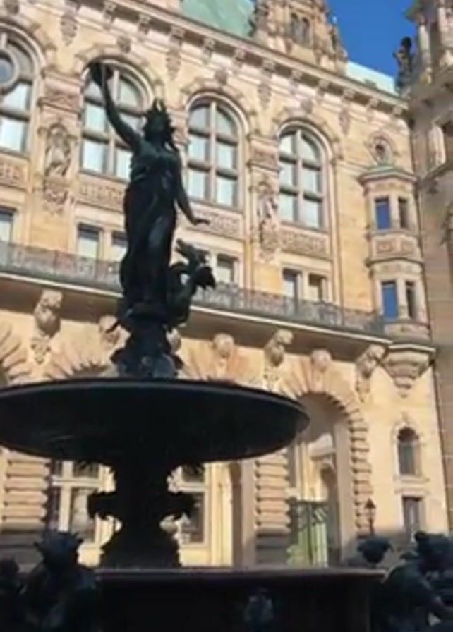 fountain with a statue in front of a large, ornate building. The fountain is black and has several tiers, with water flowing from the top. The statue is of a woman standing on a creature that appears to be part dragon. The building is made of light-colored stone and has many windows and decorative elements. The sky is blue and clear. The camera pans up to show the full height of the building.
