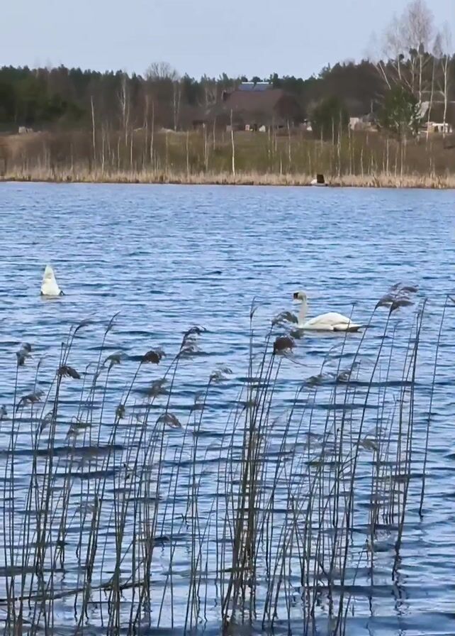 A horizontal, still video shows two swans on a blue lake. The reeds in the foreground are slightly brown. The swans are both white. One has its head in the water, and the other has its head up and swims slowly. Behind the lake is a forest with buildings on the edge. The sky is slightly overcast.