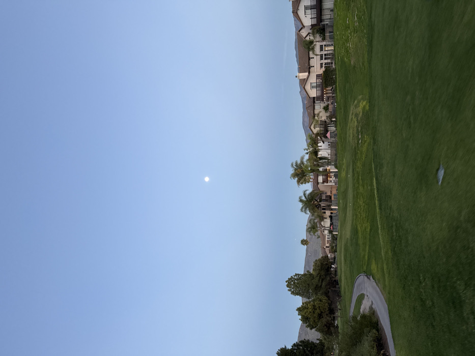 The image displays a twilight scene over a residential golf course in Chula Vista, United States of America. A prominent, bright moon is centered high in a clear, light blue sky that fades to a lighter hue near the horizon. The foreground features a manicured green golf course, with a paved golf cart path curving from the lower-left corner into the midground. No individuals or golf activity are visible. To the left, a cluster of evergreen trees borders the course. In the midground, a row of multi-story residential houses with light-colored exteriors, balconies, and tiled roofs lines the edge of the golf course, interspersed with several palm trees. In the background, a range of arid, muted-colored mountains extends across the horizon.