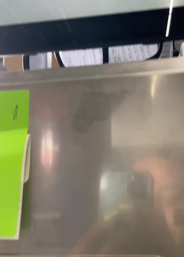close-up shot of a computer screen displaying "Scan of typ order en operatie" with a hexagon-like icon above it. Below the screen, there is a stainless steel surface with a green paper label partially visible on the left side. As the camera moves downwards, it focuses on the green paper label which is a product label with information printed in black, including the text "MBI De steenmeesters," "Geocorso," and dimensions of "80x40x4 cm," as well as "Rimini." In the reflection on the stainless steel, a person is visible holding a smartphone. The text on the label indicates that it relates to stone products.