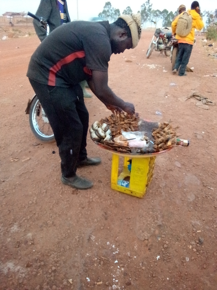 This image depicts an outdoor, informal food vending scene in Durimi, Nigeria