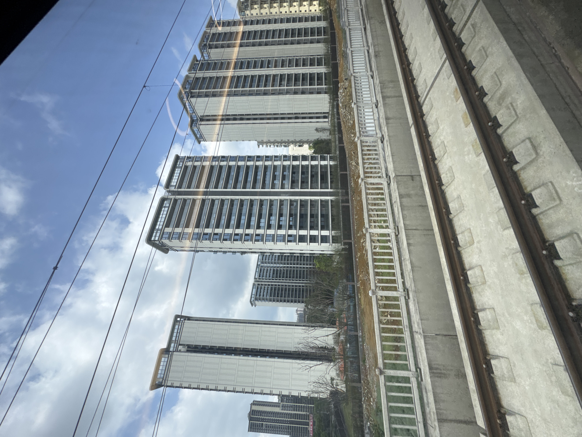 From the perspective of a window inside a moving train, a concrete railway track runs parallel to a series of modern high-rise buildings, reflecting in the glass