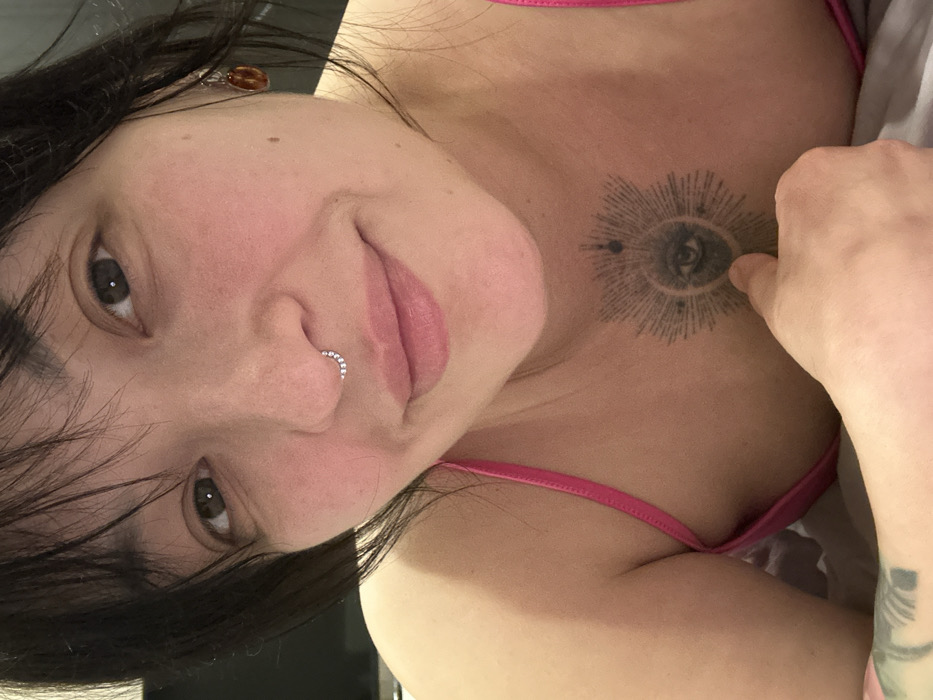 A woman with dark hair and brown eyes is lying on her side, facing the camera. She has a ring in her nose and a tattoo of an eye on her chest. She is wearing a pink top. Her right hand is raised near the tattoo. The image is well-lit and has a shallow depth of field, with the woman's face in focus and the background slightly blurred.