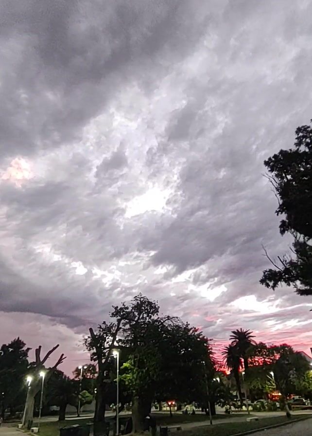 park scene under a dramatic, cloudy sky