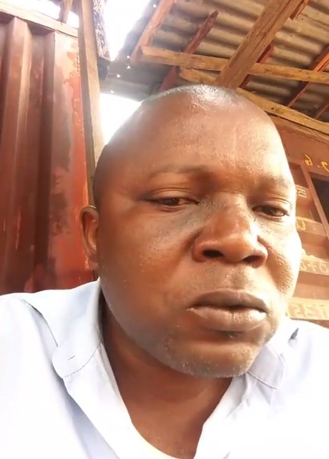 A bald man with dark skin is the primary focus of the video. He wears a light blue shirt. The background consists of a reddish-brown structure, possibly a building or container, partially visible on the left side of the frame. Above the man, there is a corrugated metal roof supported by wooden beams. The lighting is somewhat bright, creating a bit of glare on the man's forehead. The man's facial expression is neutral, and he appears to be looking directly at the camera. He sticks out his tongue for a moment.