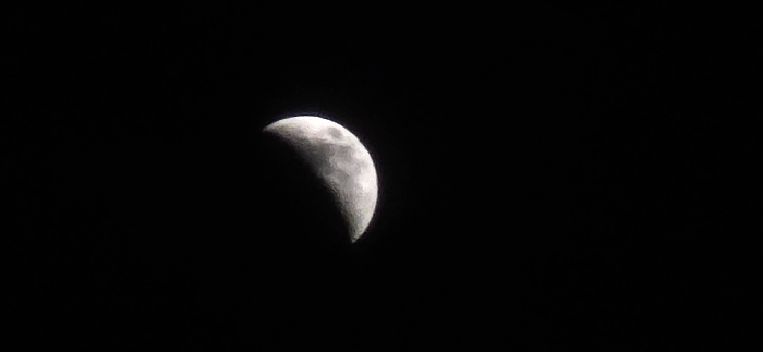 A waxing crescent moon is centered in the upper half of a vertically oriented image, set against a uniformly black night sky. The moon's illuminated right-hand portion displays a textured surface with visible craters and variations in shades of white and gray. The unlit, left-hand section of the lunar disk is indistinguishable from the dark background. No stars, other celestial bodies, terrestrial features, individuals, or actions are discernible within the frame. The scene represents a nocturnal astronomical observation from Veliko Tarnovo, Bulgaria.