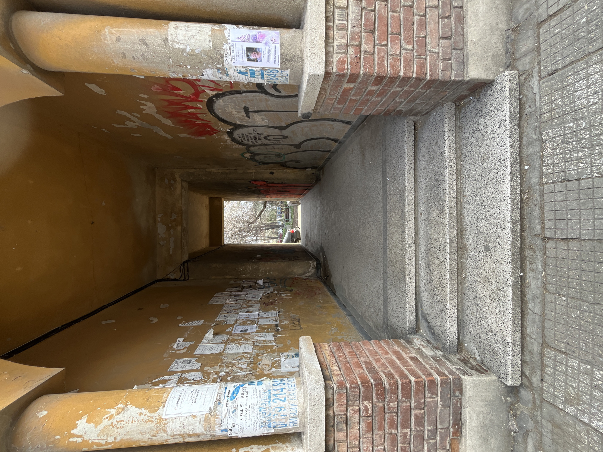 The image displays an architectural passageway in Plovdiv, Bulgaria, viewed from its entrance looking outward. Three granite-aggregate steps rise from a grey square-patterned concrete sidewalk into a tunnel-like archway. The entrance is flanked by two cylindrical columns, painted a faded yellow with significant peeling paint and white residue. These columns rest on rectangular plinths constructed from reddish-brown brick with grey concrete caps. The left column is extensively covered with layered white paper posters, many featuring Cyrillic text and telephone numbers, including "088" and "079 214 848." The right column also bears multiple posters, notably one with a photograph of an elderly woman, labeled "ТЪЖЕН ПОМЕН" (Sad Commemoration/Obituary). The interior walls and ceiling of the archway are painted the same faded yellow, exhibiting peeling paint and grime. The left interior wall is heavily covered in layered white paper posters. The right interior wall is marked with extensive red and black graffiti, including bubble-style lettering. A black electrical conduit runs along the upper left corner where the wall meets the ceiling. The floor of the passageway is worn, light grey concrete. At the far end of the archway, an outdoor scene is visible. Leafless deciduous trees line what appears to be a public space or street. A dark-colored sedan, possibly green or black, is partially visible parked on the right side of the exit. No individuals are present within the frame.