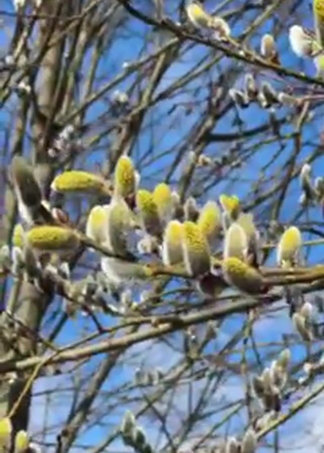 close-up shots of a tree in early spring. The tree's branches are covered in buds and catkins, some of which are showing yellow pollen. The sky is a clear blue.