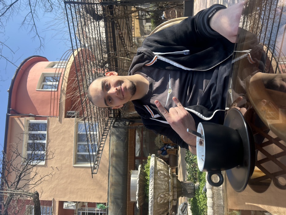 The scene depicts a young adult male seated at an outdoor cafe table in Haskovo, Bulgaria, under clear blue skies. The male, with short hair and a light beard, smiles directly at the camera. He wears a dark grey t-shirt with a winged graphic and an unzipped black hooded jacket featuring orange and white striped inner trim. His raised left hand displays a "rock on" gesture. A black mug containing a dark beverage with a spoon rests on a matching saucer on the clear glass table. In the background, to the left, is a multi-tiered stone fountain with green foliage. Behind the cafe's metal trellis structure, a two-story building with a peach-colored facade is visible. This building has several white-framed windows and a distinct curved section on its right side, painted reddish-pink, with a balcony and additional windows. Bare tree branches are present against the sky, and other patrons are faintly discernible in the deeper background. The scene is brightly illuminated by direct sunlight.