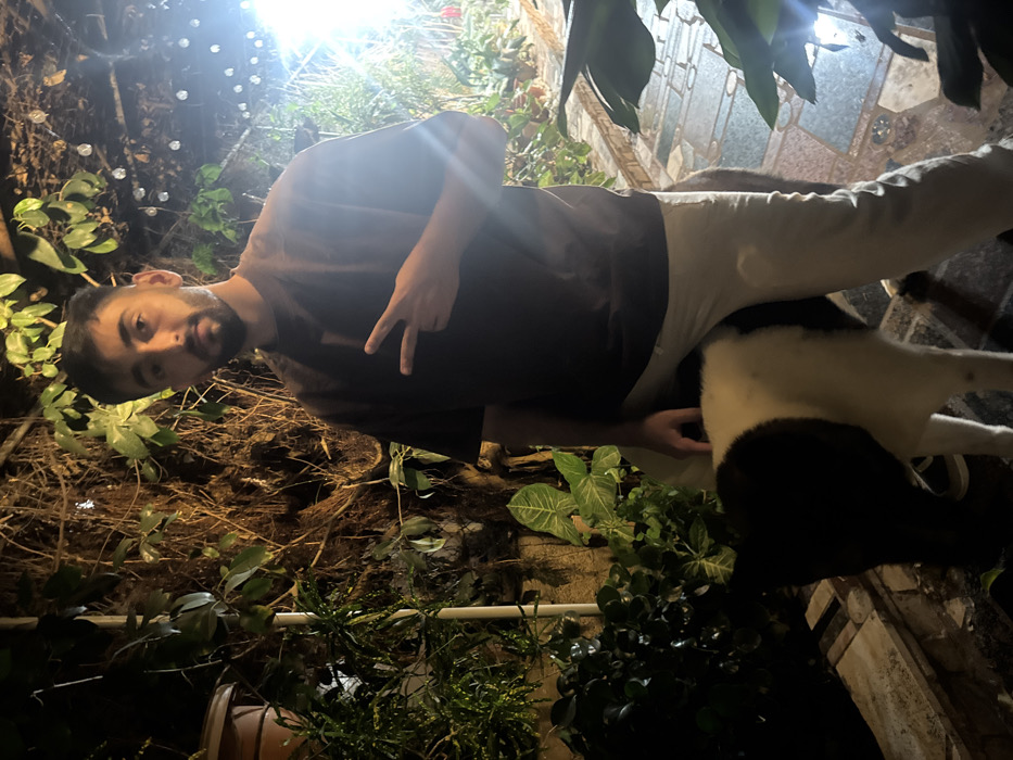The image depicts a nighttime outdoor scene in Holon, Israel, featuring one male individual and one dog. The male subject, of apparent Middle Eastern descent, with short dark hair and a trimmed beard, stands centrally, facing the camera. He wears a dark brown, short-sleeved t-shirt and light-colored trousers. His right hand is raised, displaying a two-finger 'V' gesture. His left hand rests on the back of a black and white dog, which is positioned between the man's legs, facing away from the camera with its head lowered. The background consists of dense green foliage, various plants, and intertwining branches against a dark surface. String lights with illuminated bulbs are visible in the upper right background, and a bright, artificial light source illuminates the right side of the frame. The ground beneath the subjects is a light-colored tiled surface. The environment suggests a residential garden or patio.