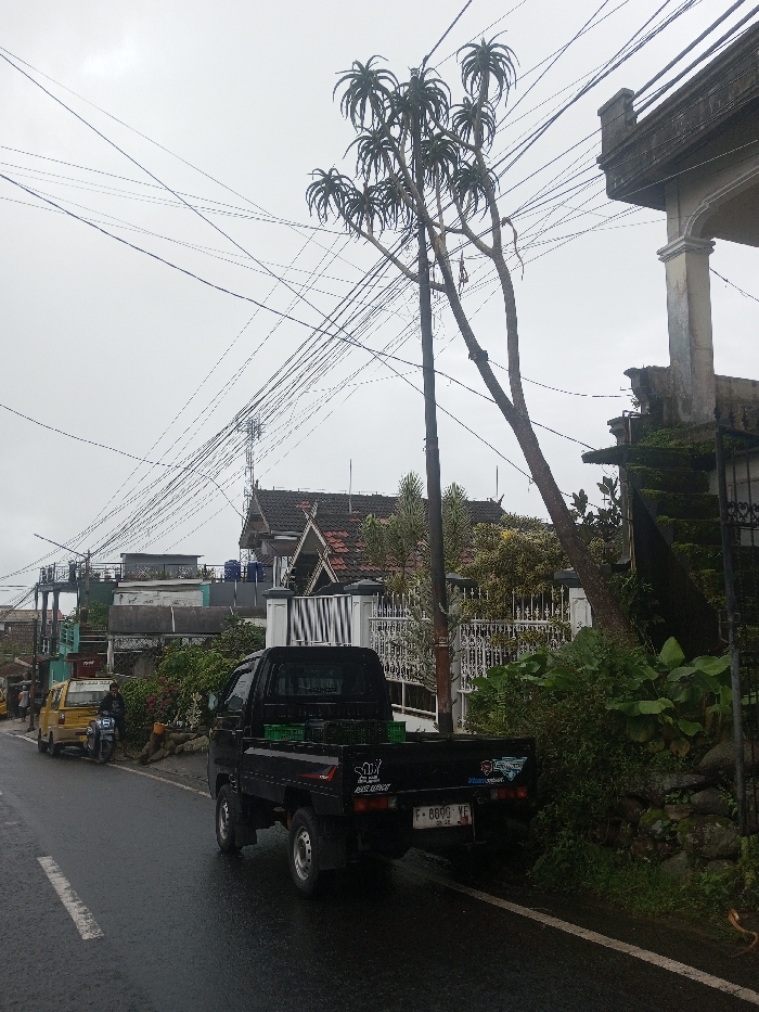 The image depicts a street scene in Babaliya Mal., India, under an overcast sky with wet asphalt surfaces. A black single-cab pickup truck, license plate F 8890 YE, is parked on the right side of the road, its bed containing several green plastic crates. A tall, slender tree with multiple branches topped by palm-like foliage stands to the right of the truck, intertwined with a dense network of overhead black utility wires that crisscross the entire upper sky. Behind the truck, a multi-story building with a concrete column and archway is visible, partially obscured by lush green vegetation and moss. Further down the street on the left, a yellow utility vehicle is parked, with a motorcycle and a solitary individual seated upon it immediately in front. In the background, residential buildings with distinct reddish-brown tiled roofs and a cellular tower are visible against the grey sky. White lane markings are present on the road surface.