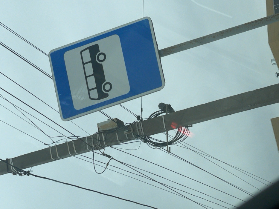 This image depicts a roadside scene in Aksay, Russia, under an overcast sky. The primary subjects are a heavily wired concrete utility pole and a bus stop sign. The utility pole, positioned on the left, is grey and supports numerous black electrical and communication cables, which are secured with white straps at various intervals. A small, rusty, rectangular metal junction box is affixed to the pole, and further down, a large coil of black cable is visible, with a faint red light emanating from a small device attached near it. To the right of the utility pole, a rectangular bus stop sign with rounded corners is prominently displayed. The sign features a white inner panel with a black silhouette of a four-windowed bus, framed by a blue border. It is mounted on a slender, rusted metallic pole. The background consists of a uniform light grey sky, indicative of an overcast day. A subtle dark reflection or blur is present in the lower-left foreground, suggesting the image was captured through a window. No individuals or active events are present in the frame.