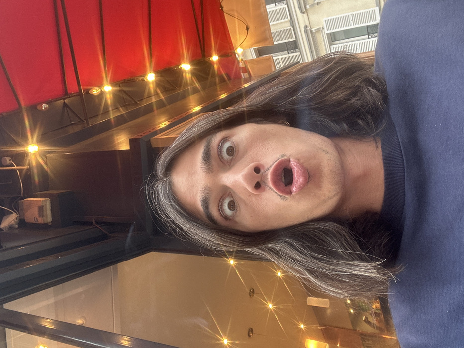 A male individual with long, dark hair, a mustache, and a dark blue crew-neck shirt is captured in a close-up selfie. His eyes are wide open, eyebrows raised, and mouth agape in an 'O' shape. A gold hoop earring is visible in his left ear. The subject is positioned in front of a glass storefront, reflecting warm interior lights. Above and behind him, a red awning is visible, adorned with a string of illuminated warm yellow globe lights. In the upper right background, a light-colored building with classic Parisian Haussmannian architecture is present, featuring windows with partially closed white louvered shutters, indicating a street-level setting in the city of Paris, France. An electrical box with wires is mounted on a dark structural beam above the storefront.