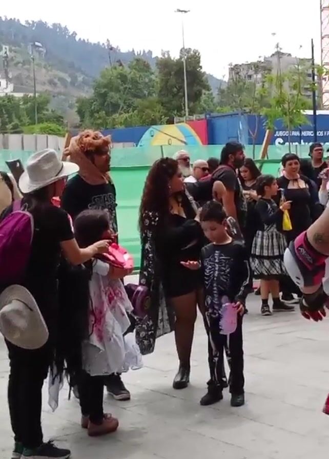 group of people gathered in a public outdoor space. Several individuals are wearing costumes, including a child in a skeleton suit and a child in a blood-stained dress. Some people are standing and talking, while a woman wearing a red plaid skirt and roller skates glides through the crowd. There is a construction crane visible in the background, along with buildings and trees. The scene appears to be a casual gathering or event.