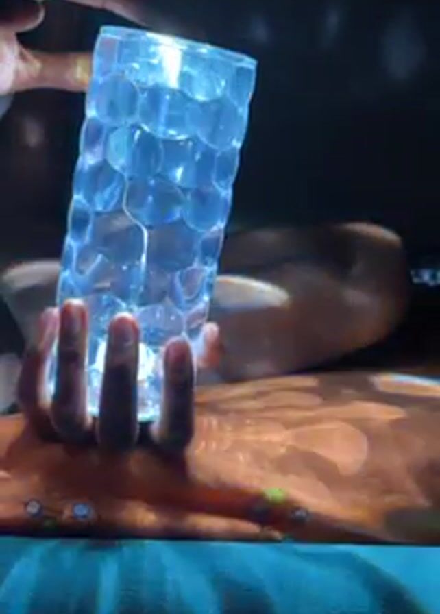 A person lies on their back on a bed, with a clear, textured plastic lamp illuminated in their hand