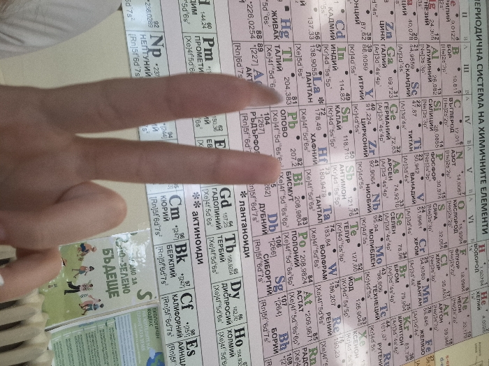 A close-up, downward-angled photograph captures a pale-skinned human hand making a V-sign with its index and middle fingers, positioned over a large, laminated periodic table of chemical elements. The periodic table displays element names and properties in Bulgarian Cyrillic, with the title "ПЕРИОДИЧНА СИСТЕМА НА ХИМИЧНИТЕ ЕЛЕМЕНТИ" prominently visible at the top. Below the hand, elements such as Mercury (Hg), Thallium (Tl), Lead (Pb), and Bismuth (Bi) are partially visible. To the lower right, a small green booklet or poster, partially obscured by the hand, features the Bulgarian text "ЗА ЕДНО ЗЕЛЕНО БЪДЕЩЕ" (For a Green Future) and cartoon illustrations of people. The setting is an indoor environment, possibly a classroom or study area, in Panagyurishte, Bulgaria.