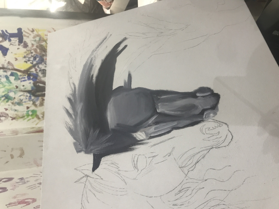 An incomplete painting of a horse is depicted on a white canvas, positioned diagonally across the frame