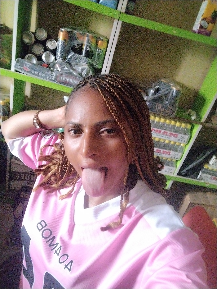 A woman with caramel-colored braids wears a pink and white shirt, playfully sticking out her tongue. She sports a watch on her left wrist. Behind her, shelves are stocked with various canned goods, bottles, and packaged items, suggesting a shop or small store setting. The shelves have a green trim.