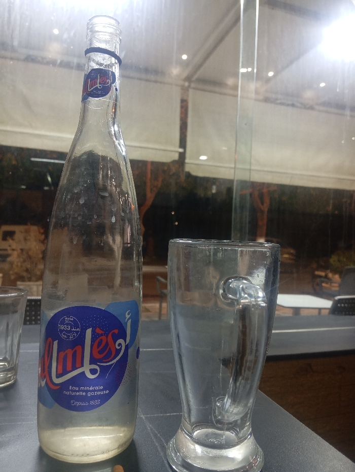 - "A near-empty bottle of Oulmès mineral water stands next to an empty glass beer mug on a table" by FM-Kfmej2, licensed under CC BY 4.0
