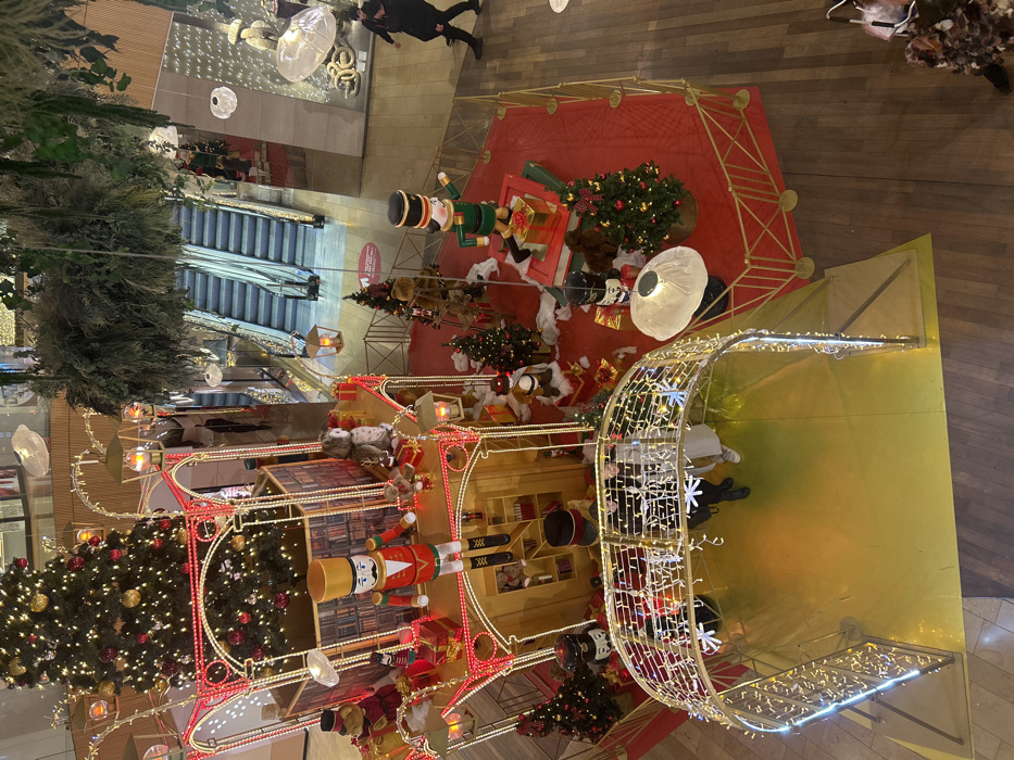 An overhead shot reveals a festive indoor scene. Elaborate Christmas decorations dominate, featuring lighted structures, a large tree, and oversized nutcracker figures. These are arranged on red and gold platforms, hinting at a holiday display in a shopping mall. Escalators and pedestrians are seen in the background, confirming a public, commercial space. Bright lights and seasonal decor contribute to the festive atmosphere.